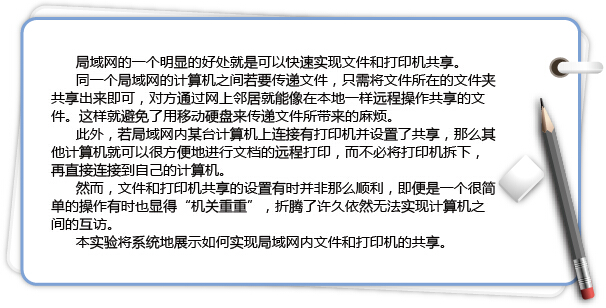 在Windows操作系统中,单个的文件不能设置为共享,若要共享某个文件,必须将该文件所在的文件夹一并设置为共享。本次实验过程中,需要将PC1上的名字为“计算机网络”的文件夹和打印机通过局域网共享给PC2。