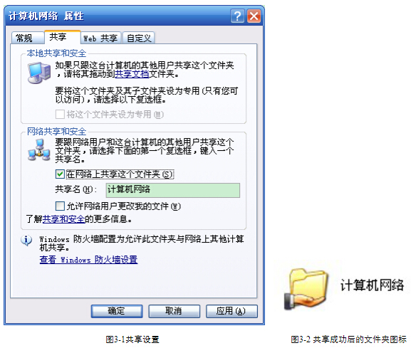 (1)在PC1上,找到需要共享的文件夹“计算机网络”,右击图标,单击“共享和安全”命令。在打开的“计算机网络 属性”对话框中,打开“共享”选项卡,勾选“在网络上共享这个文件夹”,图3-1,然后单击“确定”按钮。共享设置成功后,发现该文件夹的图标上多了一个手的形状,图3-2。如果磁盘的文件系统格式为NTFS,则设置共享时稍稍有些麻烦,详情请查阅相关资料。