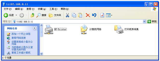 (8)在PC2上,在“我的电脑”的地址栏内输入:\\192.168.0.11,系统会弹出请求身份验证的窗口,在此输出PC1的管理员用户名和密码即可,图3-3。身份验证后,便可在PC2上访问PC1共享出来的文件夹和打印机,图3-4。