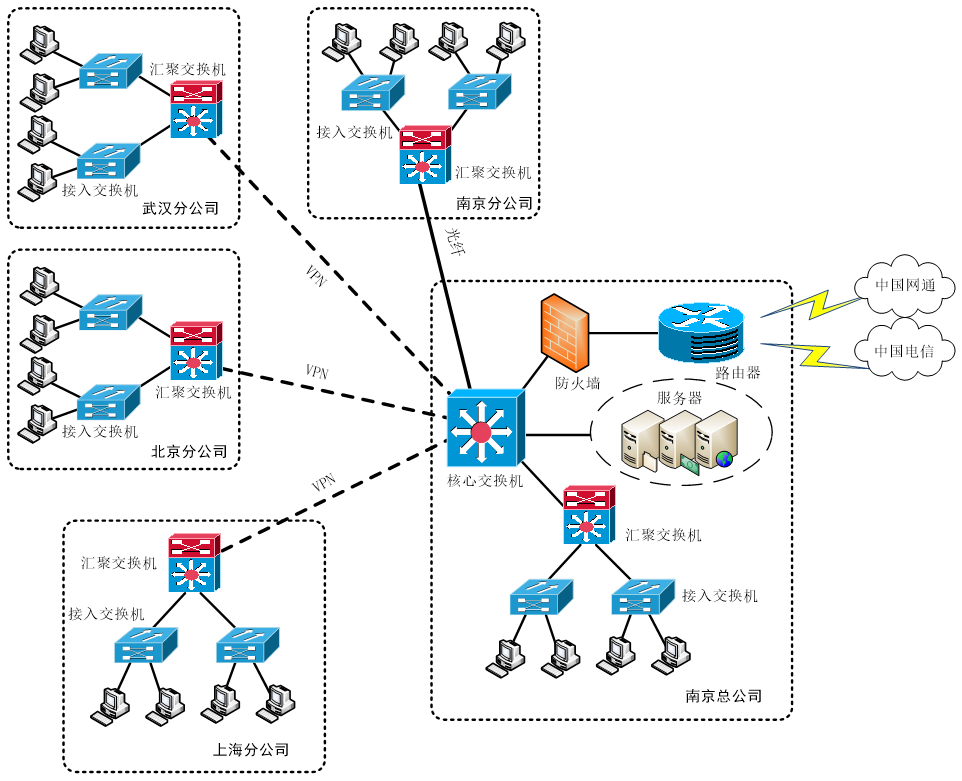 最终形成的方案是:以总公司为核心,配置完整的网络体系,通过中国电信30M和中国网通100M两个出口连接到Internet。然后第一分公司由于距离总公司较近,可以通过光纤连接到总公司,第二、三、四分公司通过VPN连接到总公司,进而实现企业内部信息共享与安全控制。