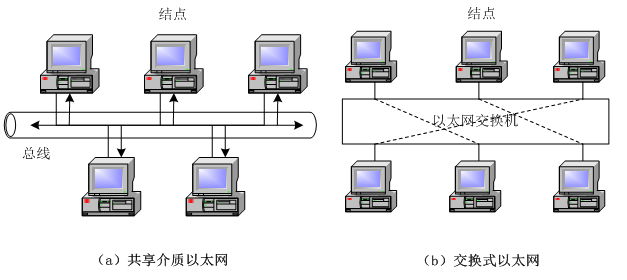 共享式网络当数据和用户数量超出一定的限量时,就会造成碰撞冲突,使网络性能衰退。而交换式网络则避免了共享式网络的不足,交换技术的作用便是根据所传递信息包的目的地址,将每一信息包独立地从端口送至目的端口,避免了与其它端口发生碰撞,提高了网络的实际吞吐量。共享式以太网与交换式以太网的区别如图1所示。