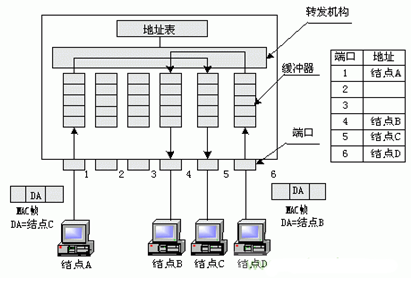 在地址表中注册登记 → 组数据帧,指定目的地址 → 通过端口缓冲发往控制中心 → 在控制中心完成端口 → 帧转发至指定的端口