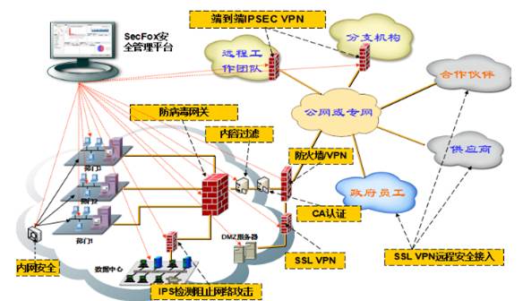 在非可信网络接口处安装访问控制防火墙、蠕虫墙、Dos/DDos墙、IPsec VPN、SSL VPN、内容过滤系统。