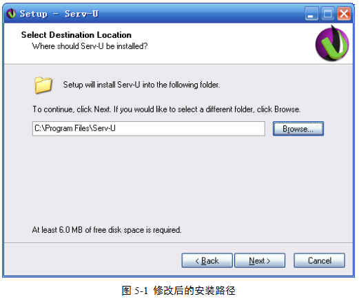 (2)在安装过程中,需对安装路径略作修改。修改的目的是便于接下来的汉化工作。在图5-1所示的安装路径里面,将字符串“\RhinoSoft.com”手动删除,确保程序的最终安装路径为:C:\Program Files\Serv-U。然后单击Next按钮。