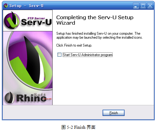 (4)安装至Finish界面时,将Start Serv-UAdministrator program复选框前面的“√”去掉,图5-2。然后单击Finish按钮。暂时不启动该软件的原因是:汉化工作尚未完成。