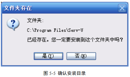 (6)在光盘中,执行“实验5”| ServU63 | Chinesization.exe ,对软件进行汉化处理。汉化程序按照默认的路径进行安装即可。安装过程中会出现图5-5消息框,询问是否将文件安装到“C:\Program Files\Serv-U”,单击“是”按钮即可。