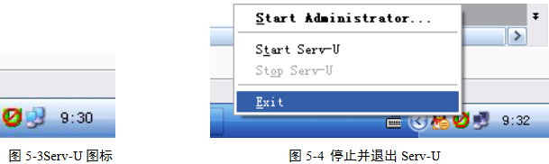 (5)此时在屏幕右下角的任务栏托盘区,出现了Serv-U的图标,图5-3所示。然后右击该图标,在弹出菜单中,如果Stop Serv-U命令可用,则应先单击此命令,将Serv-U的服务停止,然后再单击Exit命令,结束程序;若该命令为灰色,不可用,则直接单击Exit命令即可。图5-4所示。