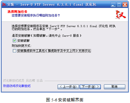 (7)安装至图5-6界面时,勾选“安装破解”复选框,并将“安装雅虎工具包”前面的“√”去掉。然后单击“下一步”按钮,直至安装完成。