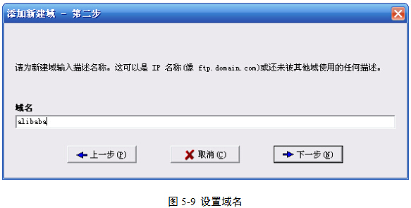 (5)在“域名”文本框中输入任意域名。这里的域名只是对域起标识作用。本例中输入域名:alibaba,然后单击“下一步”按钮,图5-9。