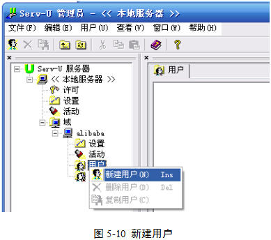 (1)右击alibaba域下面的“用户”图标,在弹出菜单中,单击“新建用户”命令,图5-10。