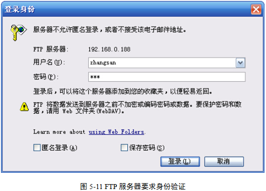 (3)在弹出登录身份验证的对话框中,输入用户名和密码,图5-11。分别输入【操作3】中设定值zhangsan和123,单击“登录”按钮,即可访问到FTP服务器为该用户指定的访问目录。此时可以像操作本地目录一样来操作远程目录(如果权限允许的话)。