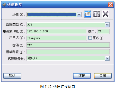 (3)按F8,打开“快速连接”对话框,图5-12。在此输入FTP服务器的地址、用户名、密码和端口号,然后单击“连接”按钮。