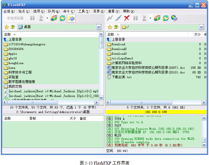 (4)连接成功后,出现工作界面,图5-13。此时,在远程目录选定要下载的文件,右击,在弹出菜单中单击“传送”命令,即可下载文件。在本地目录选定要上传的文件,右击,在弹出菜单中单击“传送”命令,即可上传文件(如果权限允许的话)。
