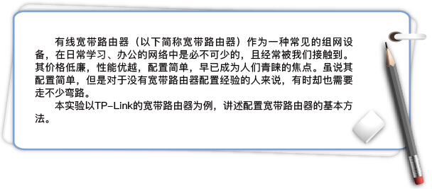 掌握宽带路由器的基本配置方法,掌握将宽带路由器降级为交换机的方法。