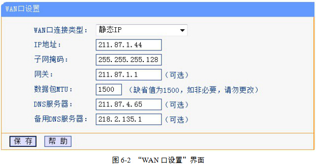 (2)在“WAN口连接类型”下列列表框中选择“静态IP”,然后依次输入其余参数,这些参数均为网络管理部门分配的参数,图6-2。一般来说,不可任意更改。