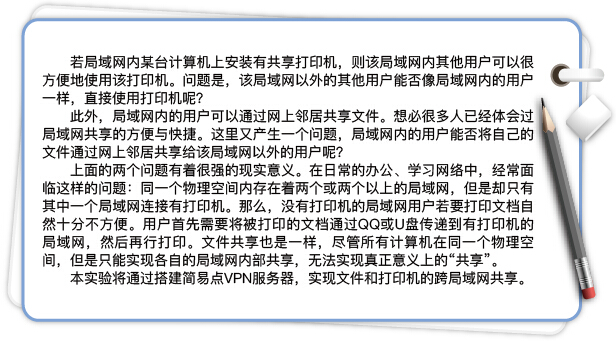 分别属于两个局域网的PC机2台(Windows XP操作系统),打印机1台。