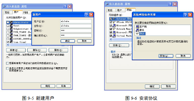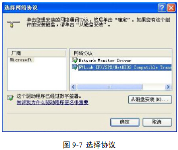 (8)在“传入的连接 属性”对话框的“网络”选项卡中,单击“安装”|“协议”|“添加”,选择包含“IPX/SPX/NETBIOS”的协议,单击“确定”按钮,图9-6和图9-7。
