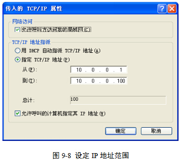 (9)在“传入的连接 属性”对话框的“网络”选项卡中,双击“Internet协议(TCP/IP)”项目,将打开“传入的TCP/IP 属性”对话框,给该连接指定一个IP地址范围,图9-8。此IP段内的IP地址将由VPN服务器自动分配给客户机。