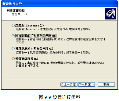 (2)在“网络连接类型”对话框中,单击“连接到我的工作场所的网络”单选按钮,图9-9,然后单击“下一步”按钮。