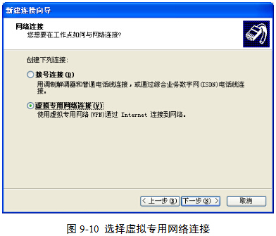 (3)在“网络连接”对话框中,单击“虚拟专用网络连接”单选按钮,然后单击“下一步”按钮,图9-10。