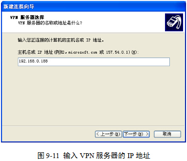 (5)在“VPN服务器选择”对话框中,输入VPN服务器的IP地址。如,这里输入“192.168.0.188”,图9-11。做实验时,请根据实际情况填写。然后,单击“下一步”按钮,直至完成。