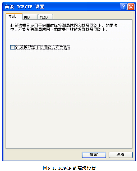 (2)右击该连接,在弹出菜单中单击“属性”命令,在打开的“属性”对话框的“网络”选项卡中,再打开“TCP/IP协议”的属性对话框,进入“高级”设置。在“高级TCP/IP设置”对话框的“常规”选项卡中,将“在远程网络上使用默认网关”复选框里的“√”去掉,图9-15,然后单击“确定”按钮。