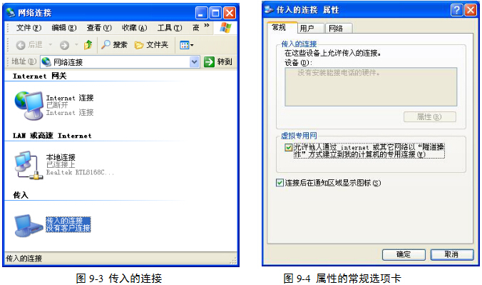(6)右击“传入的连接”,在弹出菜单中单击“属性”命令。在“传入的连接 属性”对话框的“常规”选项卡中,选中“允许他人通过 Internet 或其它网络以‘隧道操作’方式建立到我的计算机的专用链接”前面的复选框,图9-4。