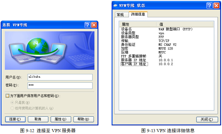 (8)连接成功后,客户端(即PC2)的右下角的任务栏托盘区会多出一个名称为“VPN专线”的网络连接的图标。双击该图标,查看其详细信息,图9-13。发现,通过VPN服务器给本地分配的IP地址为10.0.0.2,服务器的IP地址为10.0.0.1。