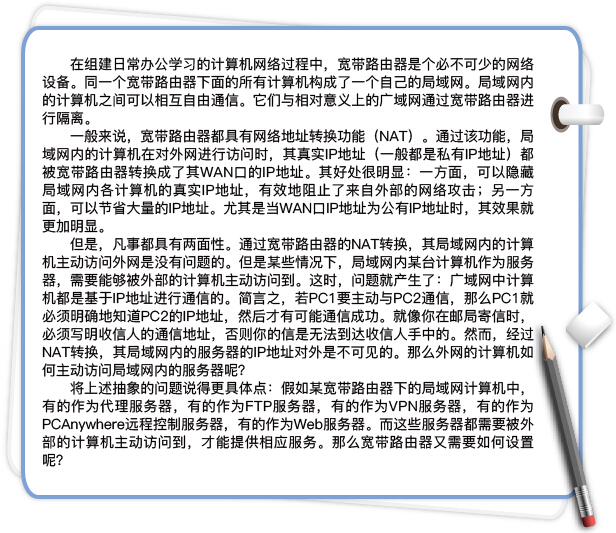 掌握宽带路由器端口映射的意义,掌握常见的服务器软件的工作端口号,能够利用端口映射功能使内网中的服务器突破其内网限制,能够成功地被外网计算机主动访问到。