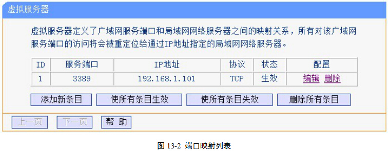 (2)执行导航栏“转发规则”|“虚拟服务器”命令,打开已配置好的端口映射列表,图13-2。