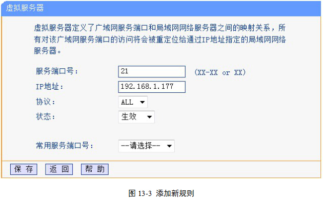 (3)单击“添加新条目”按钮,添加端口映射规则,图13-3。在此处可以添加服务端口号为21,IP地址为192.168.1.177,选择合适的协议。如果不清楚协议,可以选择ALL。最后在状态选项中设置其为生效。