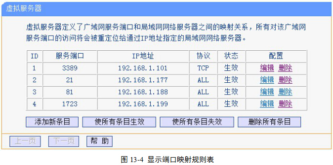 提示:在图13-4中,以ID为2的规则为例,其含义为:将对WAN口IP地址21号端口的命令请求转发到IP地址为192.168.1.177的内网计算机的21号端口上。无论其怎样映射或转发,其端口号仍然保持不变。