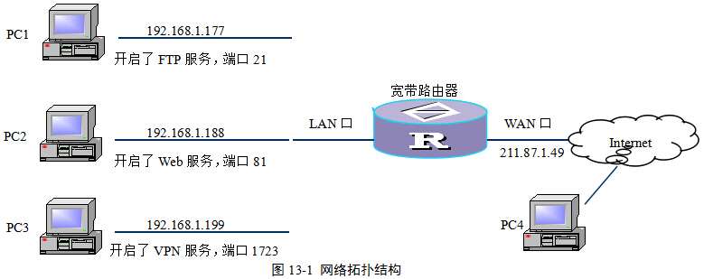 在图13-1所示的网络拓扑结构中,若PC4要对PC1上的FTP服务器进行访问,那么由于宽带路由器的NAT作用,就不能直接使用PC1的IP地址,而是应该使用宽带路由器WAN口的IP地址,如可以输入ftp://211.87.1.49:21。该地址表面上是通过FTP协议对主机211.87.1.49的21号端口进行访问。而实际上,由于宽带路由器的端口映射作用,路由器在收到访问请求命令ftp://211.87.1.49:21后,经对比映射规则,然后得出结论:该命令是要求对PC1的21号端口进行访问,于是它就主动将该请求命令转换为ftp://192.168.1.177:21,从而实现了PC4对PC1的FTP服务器的访问。由于FTP协议默认的服务端口是21号,所以,PC4可以直接使用命令ftp://211.87.1.49来实现对PC1的FTP服务器的访问,不用加上端口号21。然而对于PC4来说,它至始至终都不知道所访问的是PC1的资源。从表面上来看,似乎访问的是一台IP为211.87.1.49的服务器。而真实情况是,211.87.1.49并不是一台真实的服务器的IP地址,而是路由器的WAN口地址。因此,路由器的端口映射功能又被称为虚拟服务器。