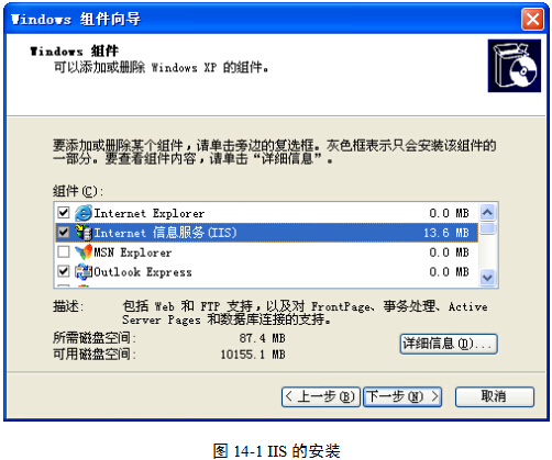 (3)在弹出的“Windows组件向导”对话框中,勾选“Internet信息服务”复选框,图14-1。然后单击“下一步”按钮,即可正常安装。