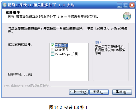 (1)在光盘中执行“实验14”| xp-IISpatch.exe ,为当前的操作系统打补丁。在图14-2中,勾选“IIS服务”复选框,然后单击“安装”按钮。