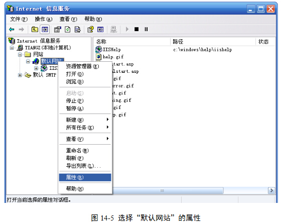 (3)在“Internet信息服务”窗口“默认网站”图标上右击,单击“属性”命令,图14-5。