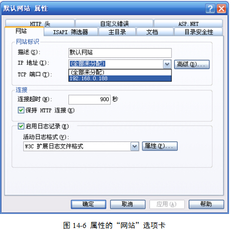 (4)在“默认网站 属性”对话框的在“网站”选项卡里,通过下拉列表框选择本机的IP地址,保持其端口默认80,如图14-6。其他的保持默认状态不要更改。然后单击“应用”按钮。