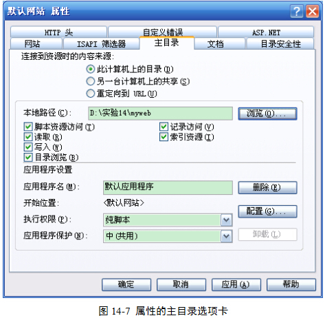 (5)接下来单击“主目录”选项卡,单击“本地路径”后面的“浏览”按钮,将路径指向“实验14”中的myweb文件夹,图14-7。该文件夹内有他人制作完成的一个简易网页,网页的文件名为index.asp。然后单击“应用”按钮。
