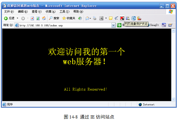 (1)打开IE浏览器,在地址栏输入http://192.168.0.188/index.asp,就可以看到图14-8所示的网站访问的界面。