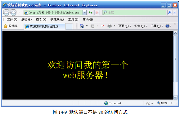 (2)如果在图14-6中,设置的TCP端口不是80,而是其他数值,比如是81。那么在访问该站点时,应该在IP地址后面加上半角冒号和端口号,否则无法对站点进行访问,例如http://192.168.0.188:81/index.asp,图14-9。