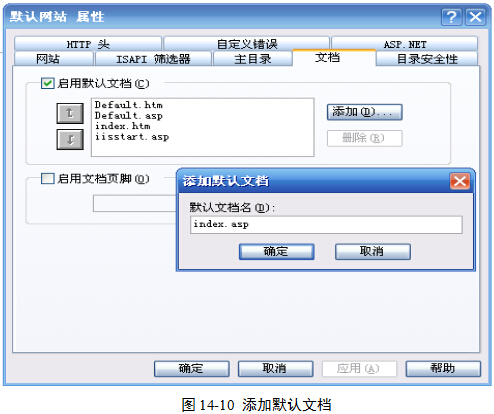 (3)在“默认网站 属性”对话框的“文档”选项卡中,单击“添加”按钮,输入:index.asp,然后依次单击“确定”按钮、“应用”按钮,图14-10。