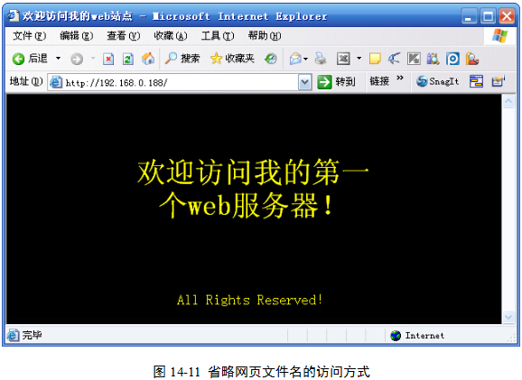 那么只需在IE地址栏输入“http://192.168.0.188/”就可以打开该网站的首页,图14-11,而无需输入像刚才那样输入index.asp才可以访问myweb下面的index.asp文件。这就是我们通常访问搜狐、百度的首页时,从来不需要指定首页文件名的原因。