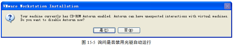 (5)安装过程中,弹出下面的图15-5所示对话框,询问是否禁用光驱自动运行,此处可以单击“是”按钮。