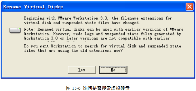 (6)安装过程中,弹出下面的图15-6所示对话框,询问是否搜索虚拟硬盘。由于是第一次安装,并没有创建虚拟硬盘,所以,此处可以单击No按钮。
