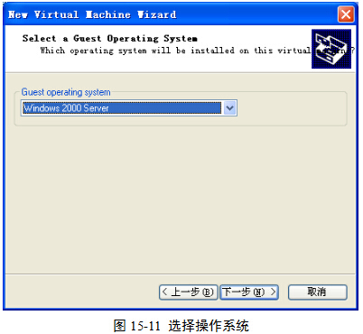 (5)为虚拟机选择即将安装的操作系统,本实验要求安装Windows 2000 server,因此,在Guest operation system下拉列表框中单击Windows 2000 server,图15-11。
