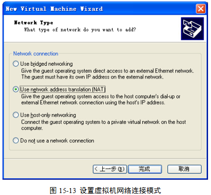 (7)选择一种网络连接模式,图15-13。这里可以单击Use network address translation (NAT)前面的单选按钮。然后,单击“完成”按钮。