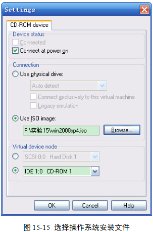 (2)在弹出的Settings对话框中,单击Use ISO image单选按钮,然后单击Browse按钮,选择“实验15”目录下的win2000sp4.iso文件,图15-15。最后单击OK按钮。.