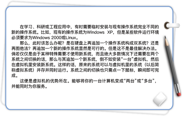 在一台电脑上将硬盘和内存的一部分拿出来虚拟出若干台机器,每台机器可以运行单独的操作系统而互不干扰,这些“新”机器各自拥有自己独立的CMOS、硬盘和操作系统,你可以像使用普通机器一样对它们进行分区、格式化、安装系统和应用软件等操作,还可以将这几个操作系统联成一个网络。这就是虚拟机。虚拟机里安装的操作系统称为虚拟系统。在虚拟系统崩溃之后可直接将其删除,而不影响本机真实操作系统。同样,只要虚拟系统文件保存完好,即使本机真实系统崩溃也不影响虚拟系统。通过虚拟机软件,你可以在自己的计算机上同时虚拟出多个操作系统。虚拟机在学习技术方面能够发挥很大的作用。
