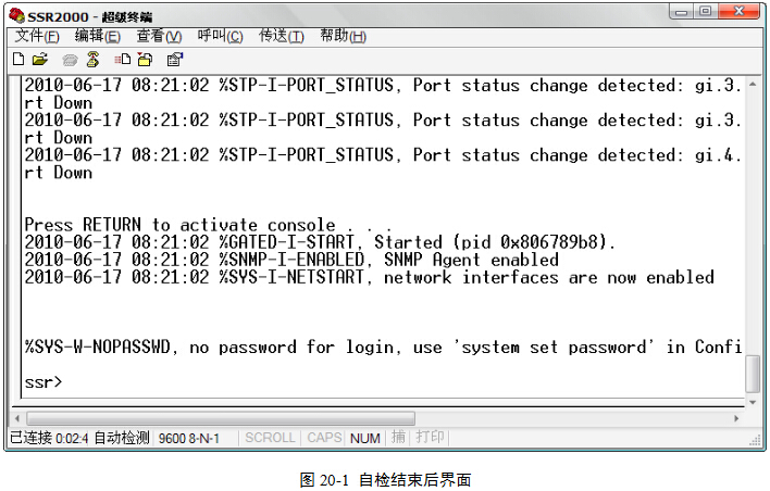 (5)交换机通电,开始自检。自检结束后,超级终端命令窗口出现激活控制电缆的提示符,图20-1。按回车键激活控制电缆。