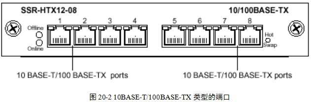 端口指的是在SSR2000中安装在线性卡上的一个物理连接。图20-2是在槽卡上10BASE-T/100BASE-TX的8个端口。